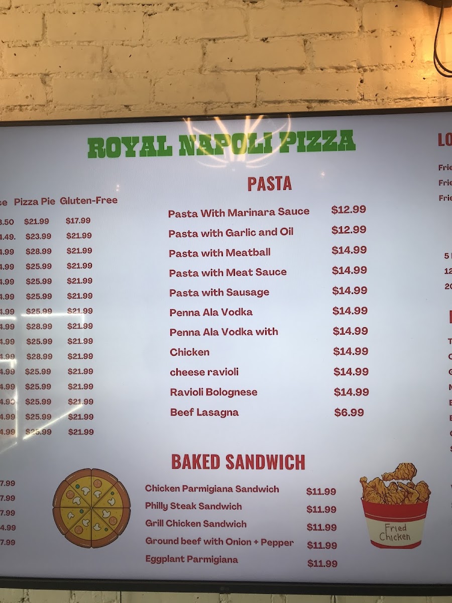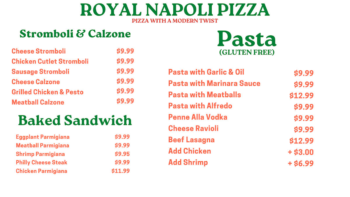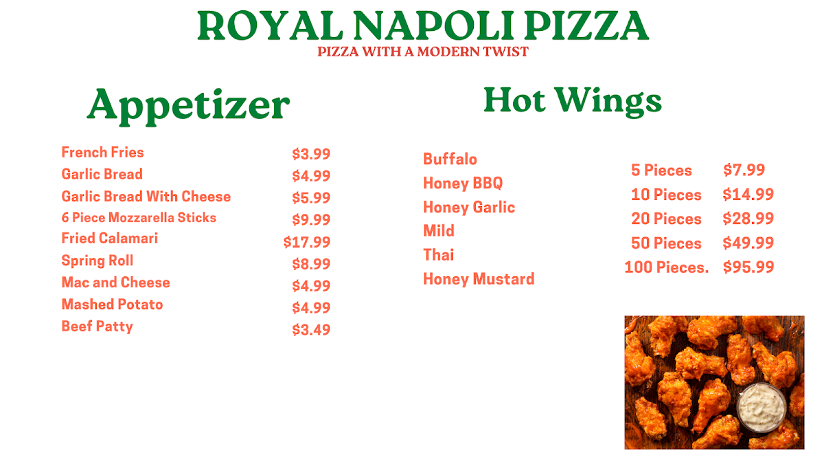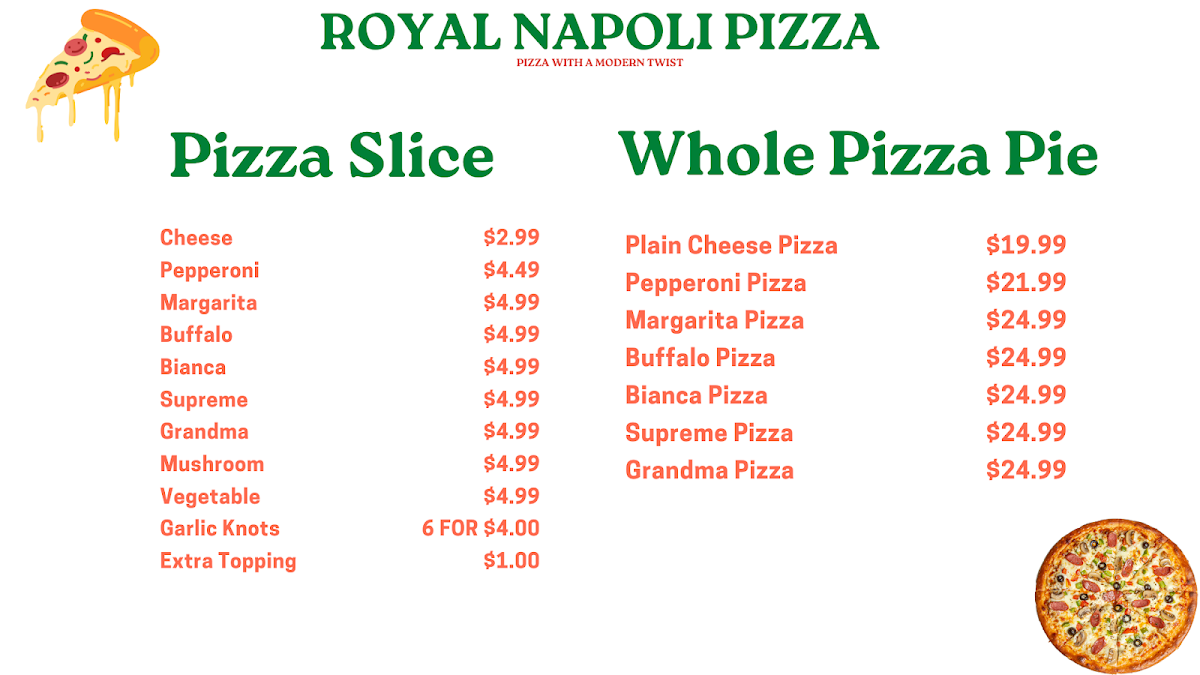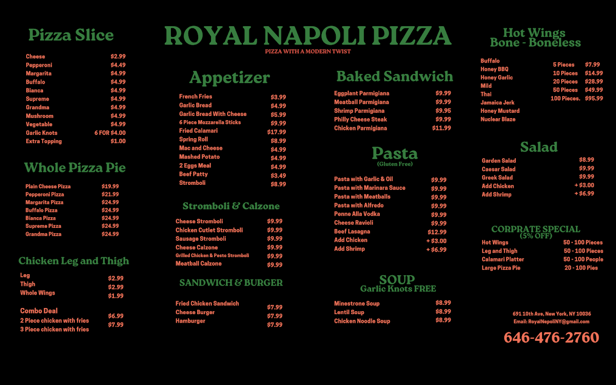 Introducing Royal Napoli Pizza, a hidden gem located at 691 10th Ave, New York, NY, known for its authentic and delectable pizza offerings. Every slice tells a story, from their classic Cheese Pizza at just $3.99 to the filling Buffalo and Vegetable options, all priced at $5.99. They also cater to dietary needs with a variety of gluten-free pizzas, receiving rave reviews from satisfied customers.